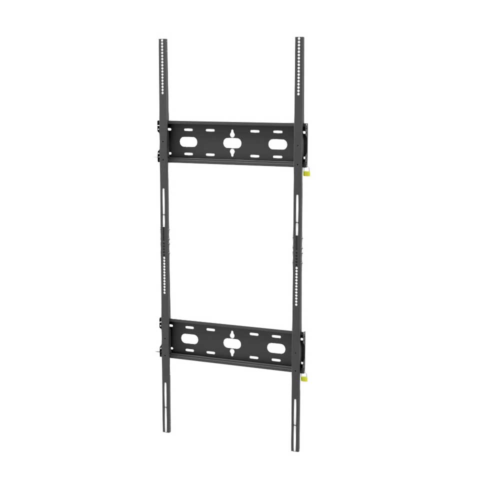 Este soporte está especialmente orientado a instalaciones con pantallas de gran tamaño en formato vertical (portrait), indicando su uso para displays de hasta 105” en este modo. Es una configuración habitual en señalización de alto impacto, directorios, comunicación institucional y entornos donde se necesitan superficies de lectura grandes con estética “tótem en pared”, pero con una instalación fija y robusta.