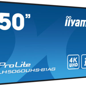 La iiyama ProLite LH5060UHS-B1AG es una pantalla profesional diseñada específicamente para Digital Signage, es decir, para la comunicación visual en entornos donde la pantalla debe trabajar muchas horas al día, mantener el mensaje visible y permitir una gestión sencilla del contenido. Con un tamaño comercial de 50 pulgadas (49,5” reales), resolución 4K UHD y un ecosistema de software integrado, este modelo encaja especialmente bien en retail, hostelería, restauración, corporativo, educación, showrooms y zonas de alto tránsito. Su objetivo no es “ser una TV grande”, sino convertirse en un canal operativo de marketing e información, con fiabilidad, conectividad profesional y herramientas de control.