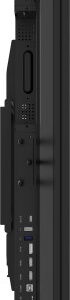 Este modelo está pensado para integrarse en instalaciones profesionales. Incluye entradas HDMI 2.0 ×2 y DisplayPort 1.2 ×1, además de salida HDMI 2.0 ×1 para escenarios de multi-pantalla (MSD). Destaca especialmente su conectividad USB-C ×2: un puerto frontal USB-C 3.2 Gen1 con Power Delivery hasta 100W (ideal para conectar un portátil con un solo cable para vídeo, datos y carga), y un USB-C lateral con PD. En red, dispone de RJ45 ×2 (IN/OUT) con conmutación automática para PC y Android, lo que facilita despliegues ordenados en red corporativa. Para integradores, también incorpora RS-232c, OPS Slot (Intel OPS 80-pin) y múltiples puertos USB (hasta 5) para periféricos, almacenamiento y reproducción.