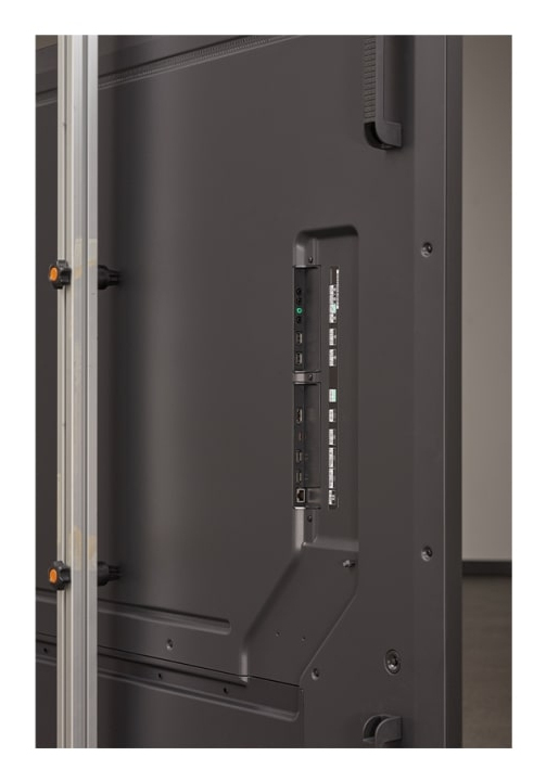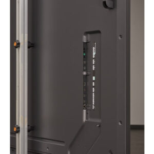 La pantalla cuenta con un diseño delgado, con dimensiones de 1928,8 mm de ancho, 1099,8 mm de alto y 29,7 mm de profundidad sin asa ni receptor IR. Su bisel uniforme de 13,4 mm aporta una estética limpia y moderna, adecuada para espacios corporativos, retail, educación y entornos profesionales donde la integración visual es importante.