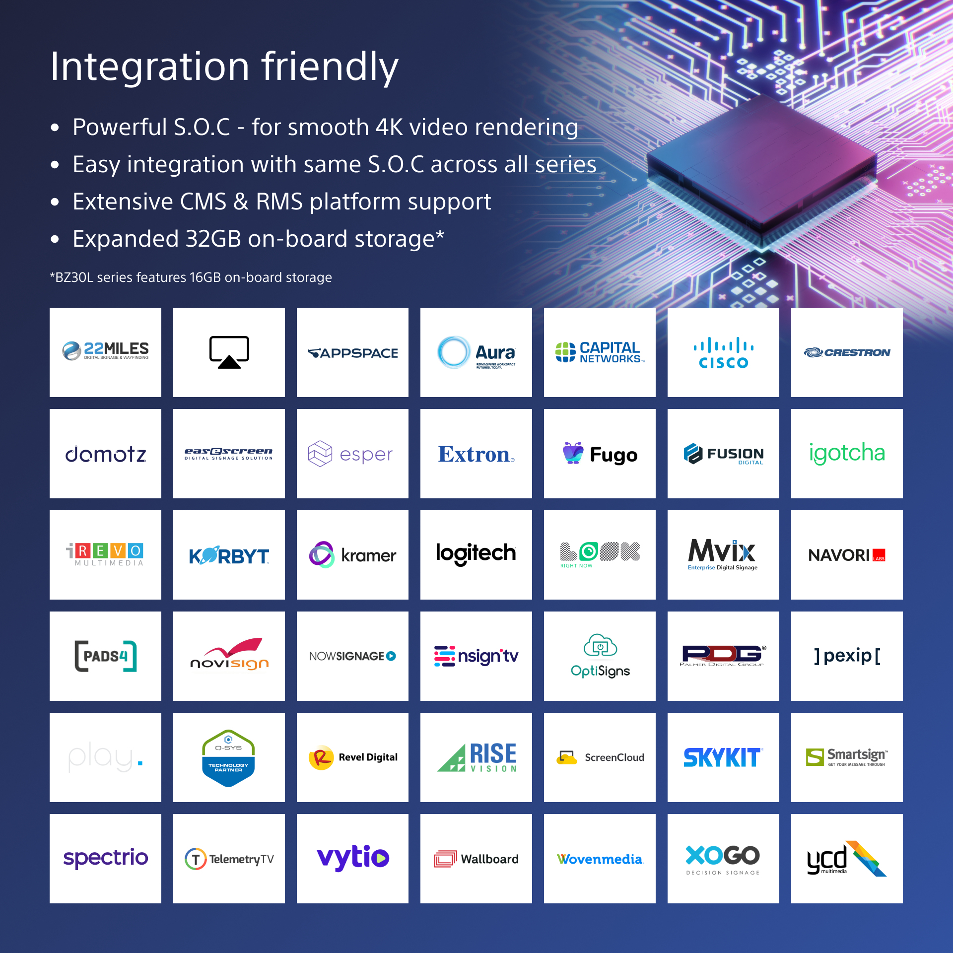 Gracias a funciones integradas como Apple AirPlay, Google Chromecast y compatibilidad con HTML5, compartir contenidos es un juego de niños. La generosa memoria internade 32 GB ofrece espacio de sobra para aplicaciones y contenidos de señalización. Además, Sony se centra en la sostenibilidad contecnologías de eficiencia energética para minimizar el consumo de recursos – para un funcionamiento más respetuoso con el medio ambiente.